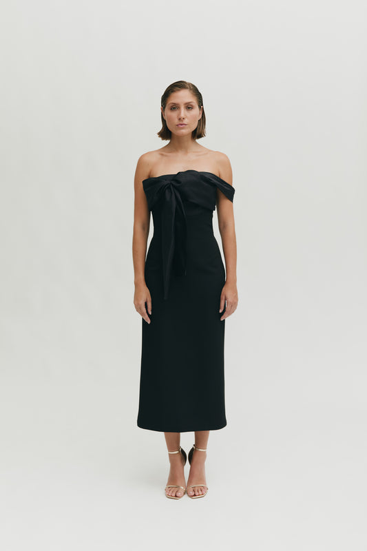 Vestido con drapeado off the shoulder