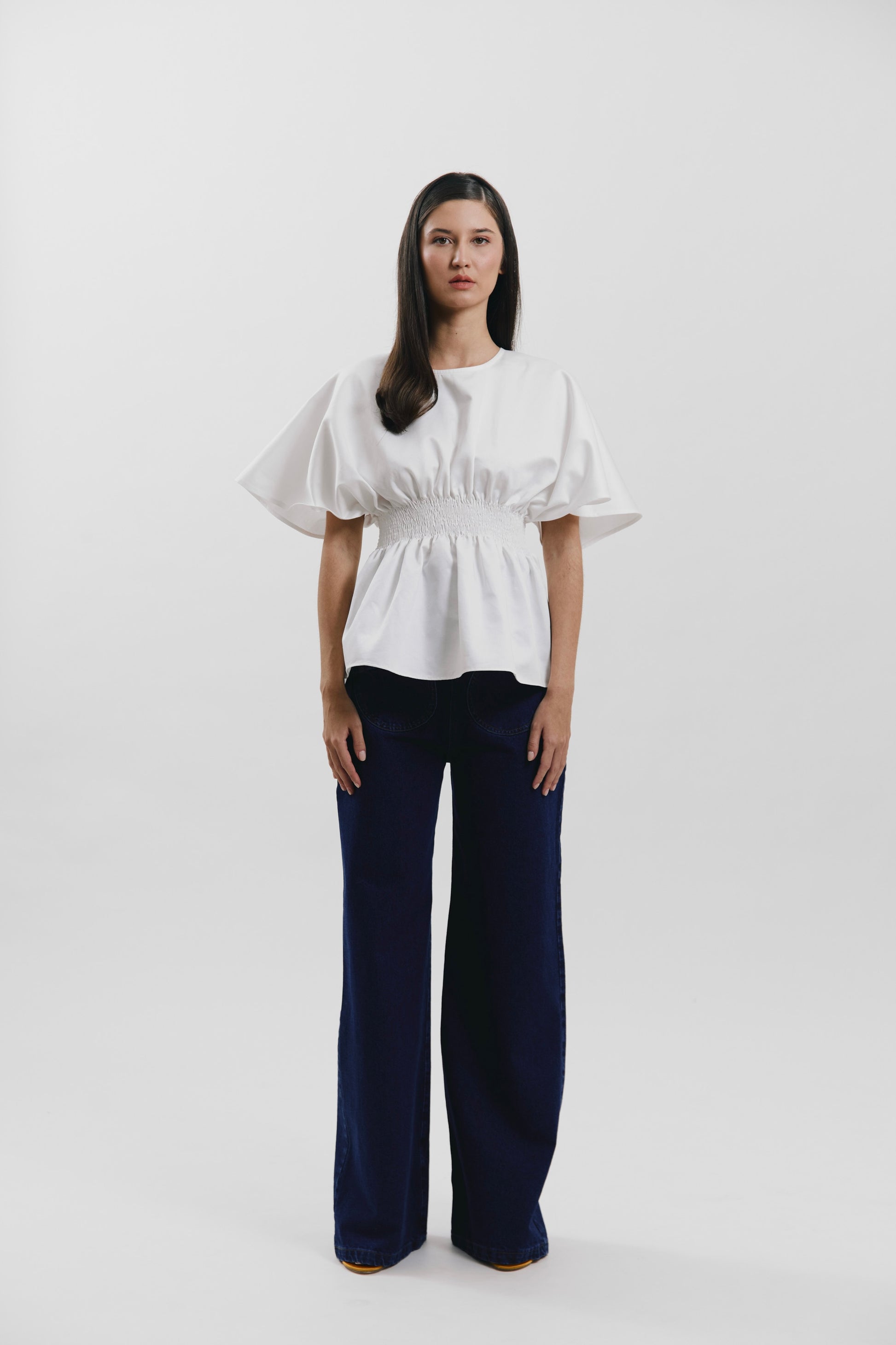 Blusa manga corta peplum con detalle nido de abeja en la cintura.