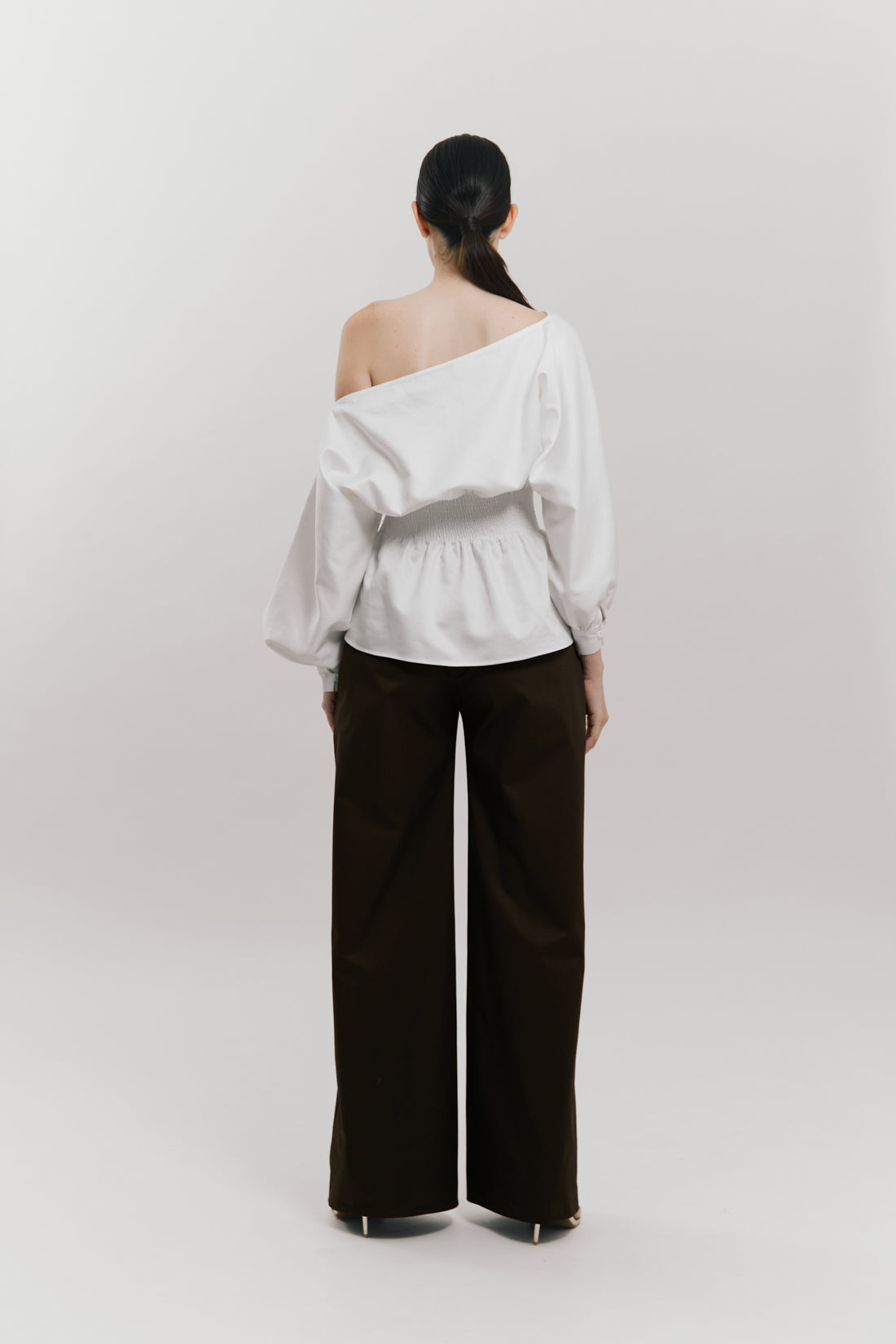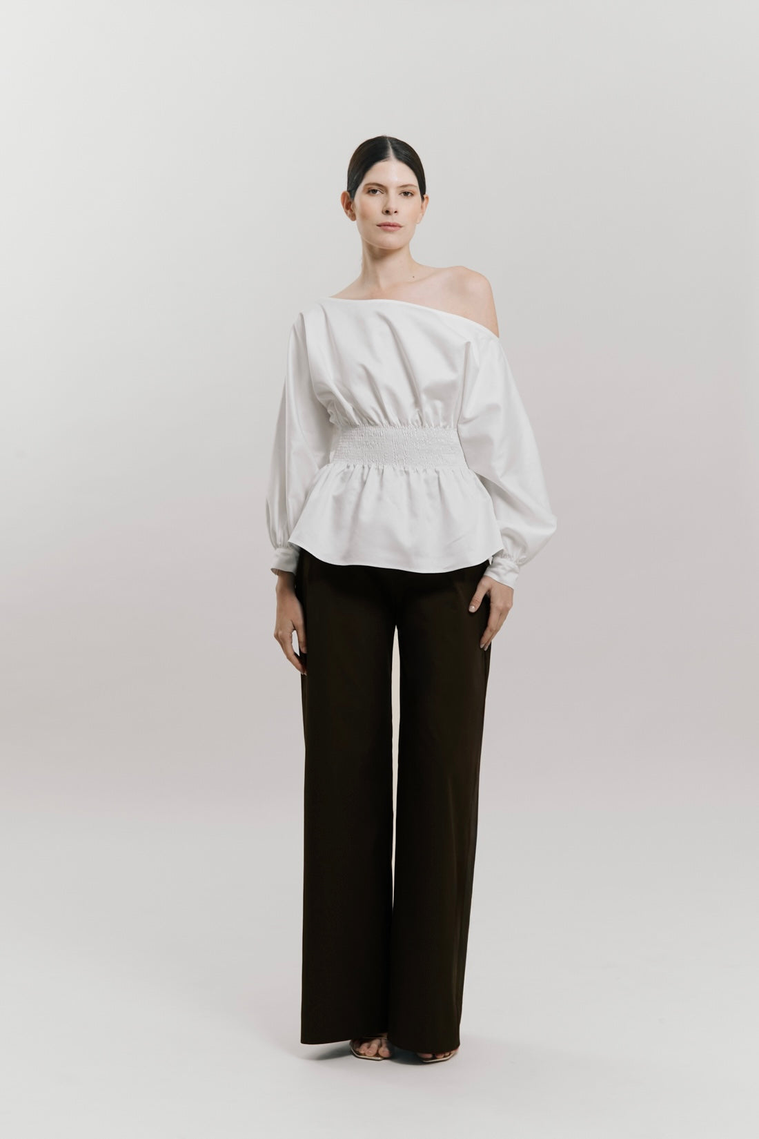 Blusa off-shoulder manga larga peplum con detalle nido de abeja en la cintura.